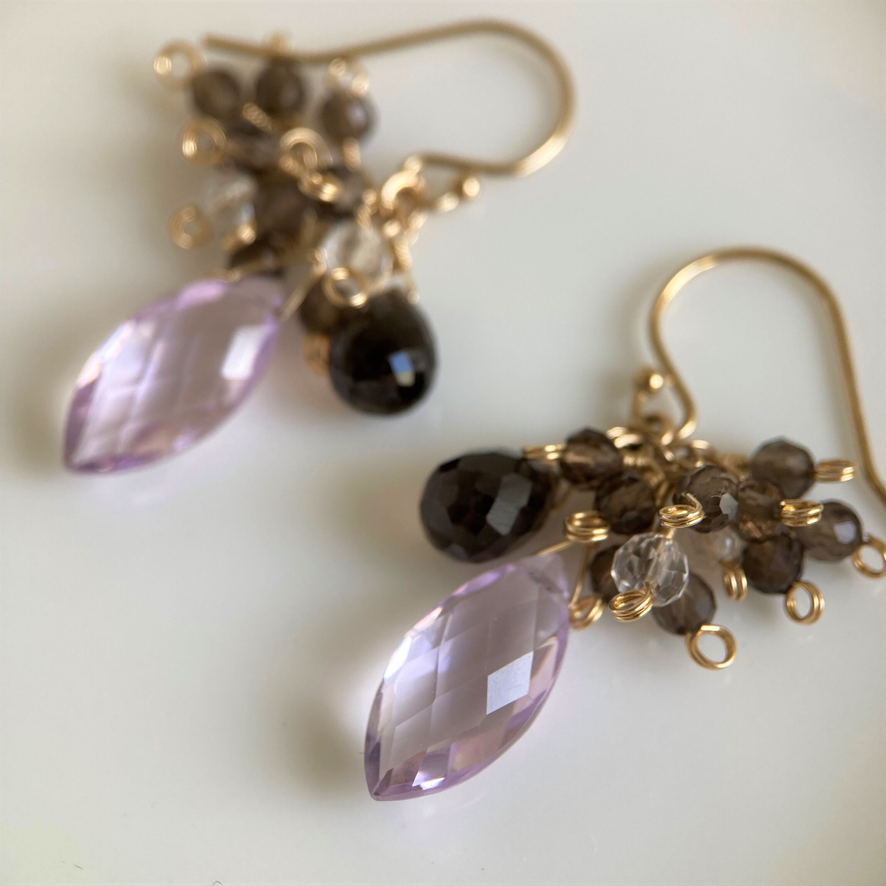 ラベンダーアメジスト ドロップカット スモーキークォーツ ピアス 大人上品アクセサリー 上品ピアス 14kgf 高品質