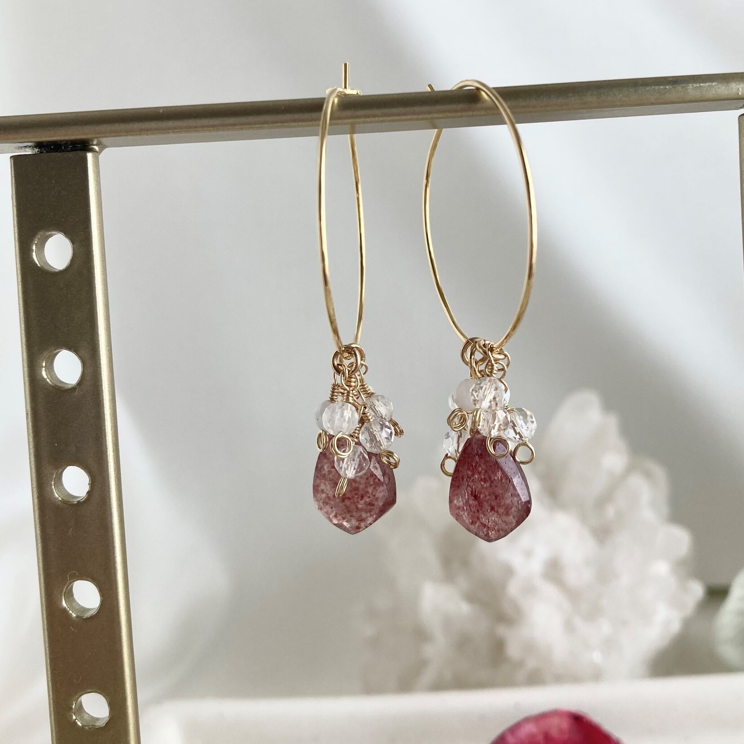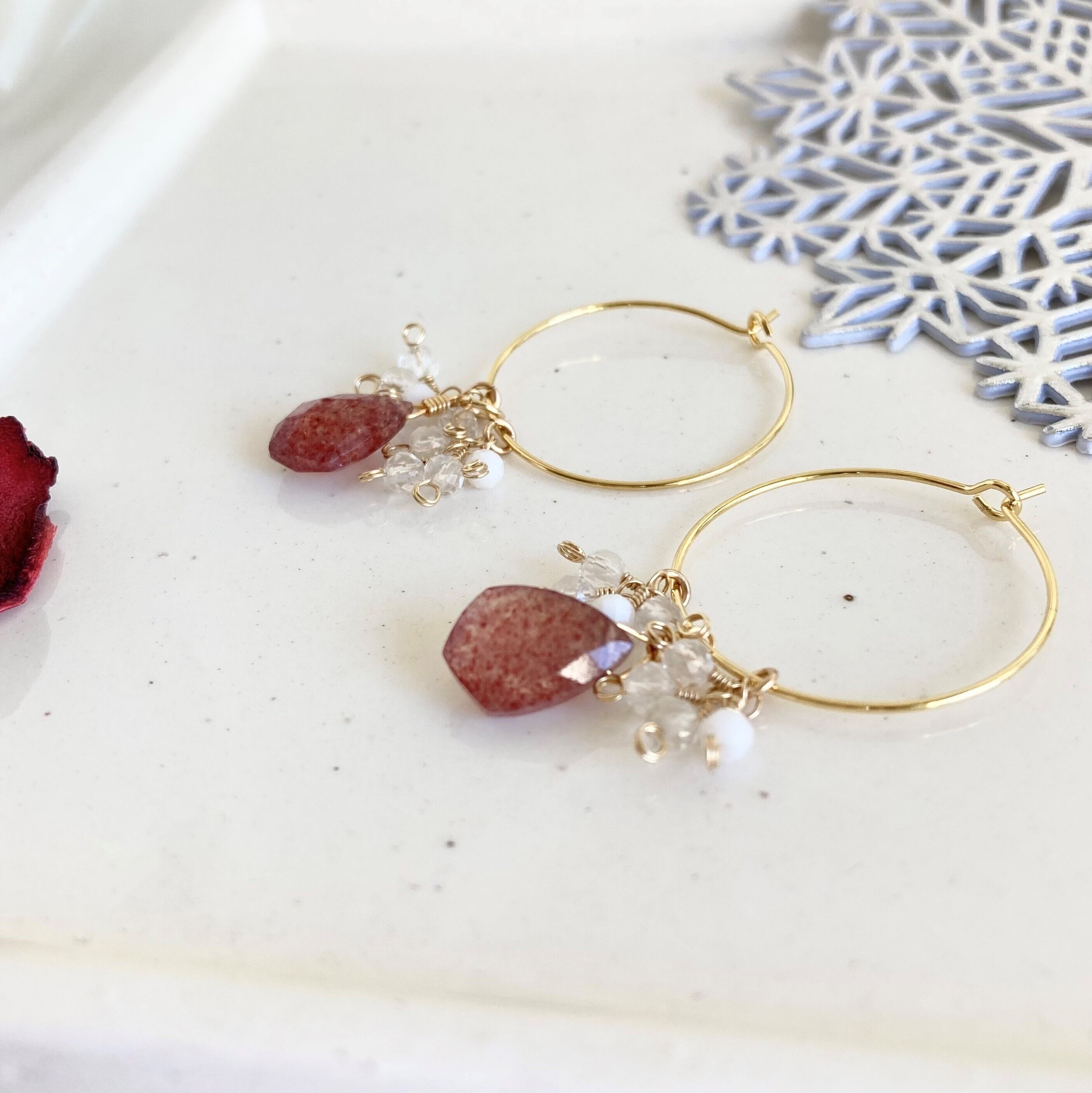 ピンクエピドート 水晶 アクセサリー フープピアス 天然石ピアス 大人上品アクセサリー 高品質 14kgf 金属アレルギー対応