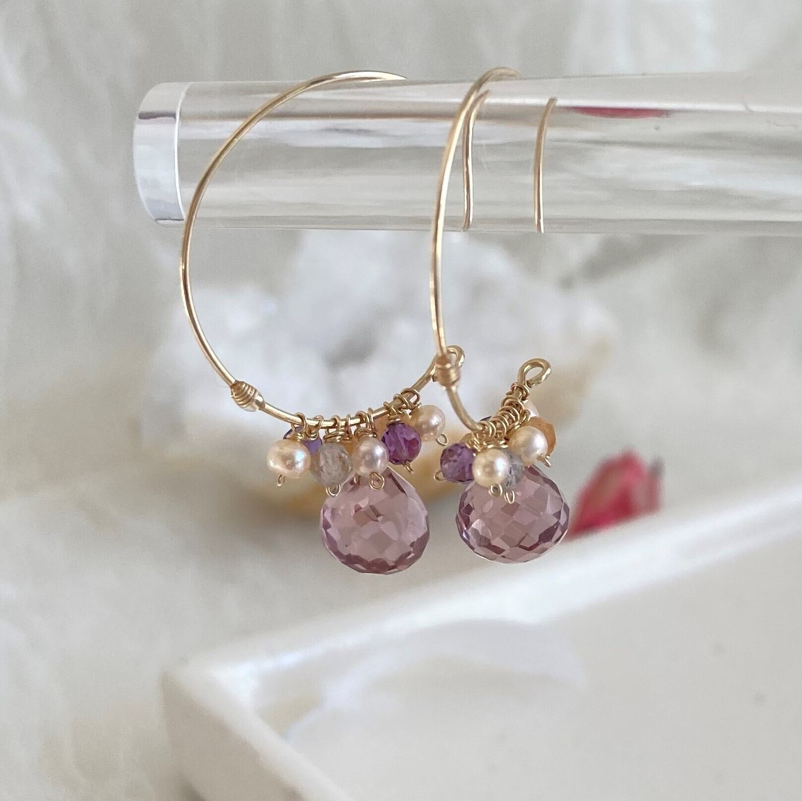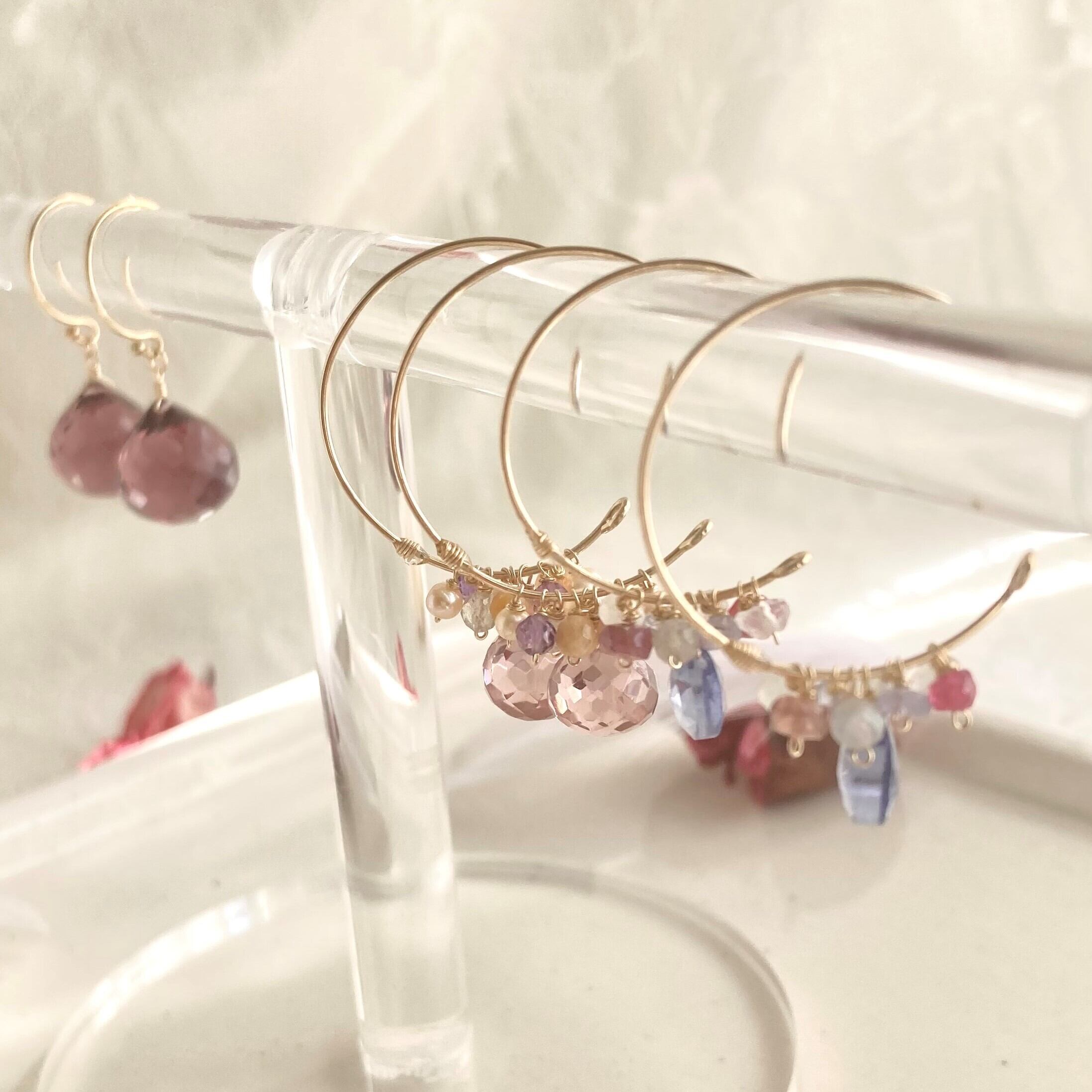 透明感、カット、発色どれも抜群の質の【クンツァイト】のフープピアス